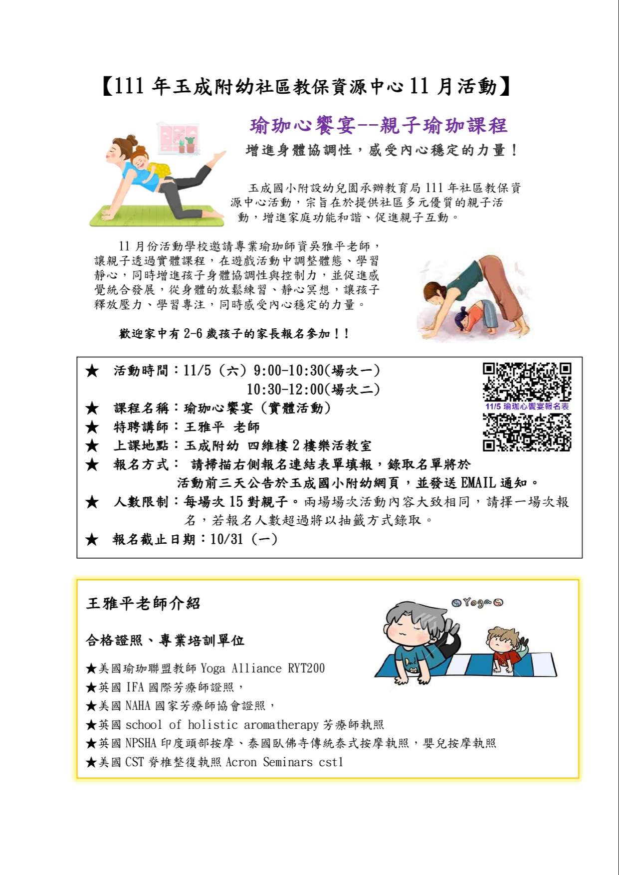 ☆★111年度玉成教保資源中心最後一場壓軸--11/5 (六)親子瑜珈活動來囉!!★☆