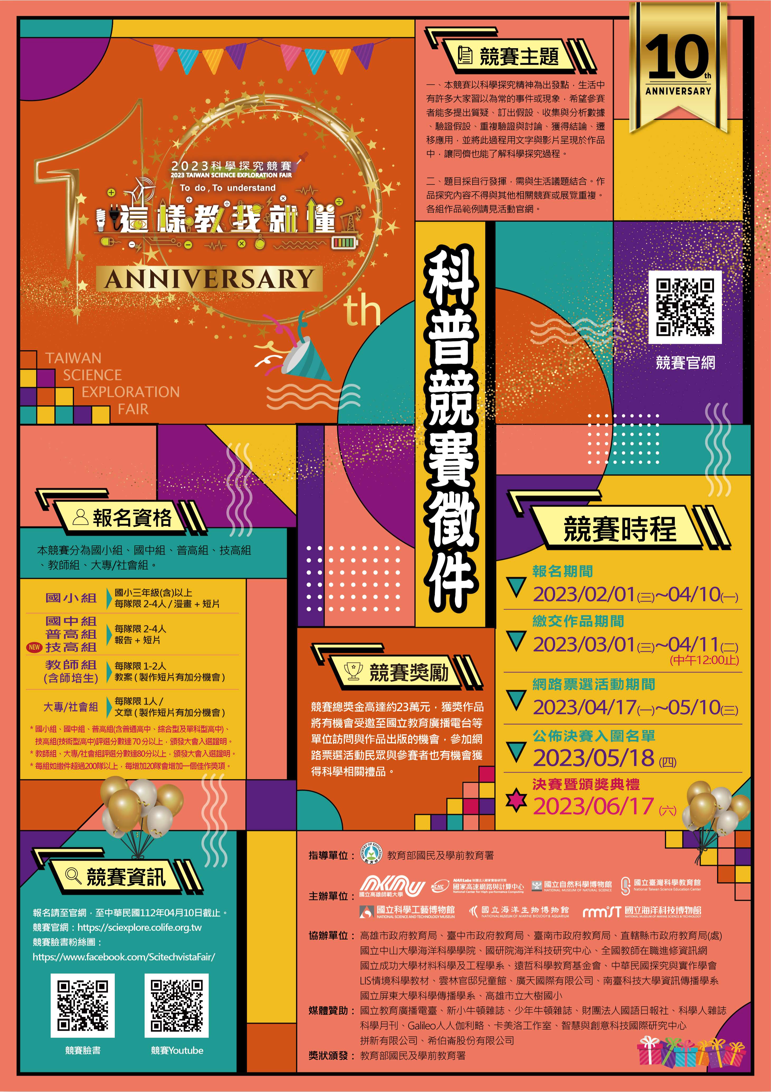 八、報名資訊、競賽方式與獎勵等相關資料請參閱附件或計畫網站(官網:http://sciexplore.colife.org.tw/;粉絲專頁:https://www.facebook.com/ScitechvistaFair/)。相關事宜如有疑義,請逕洽本競賽(施先生,電子信箱:sciexplore.tw@gmail.com)。
