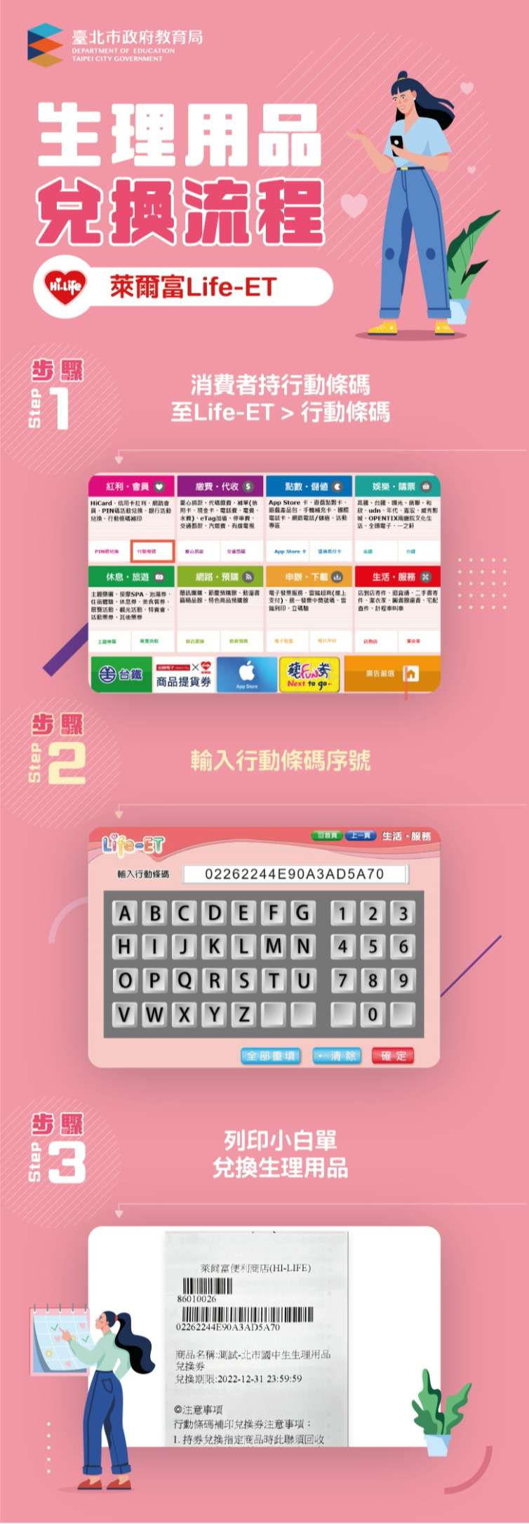 一、「112年國中小女性生理用品補助計畫」第1期兌換券2張,將於3月1日發放,兌換效期至112年4月30日止。兌換方式與流程,重點摘述如下: