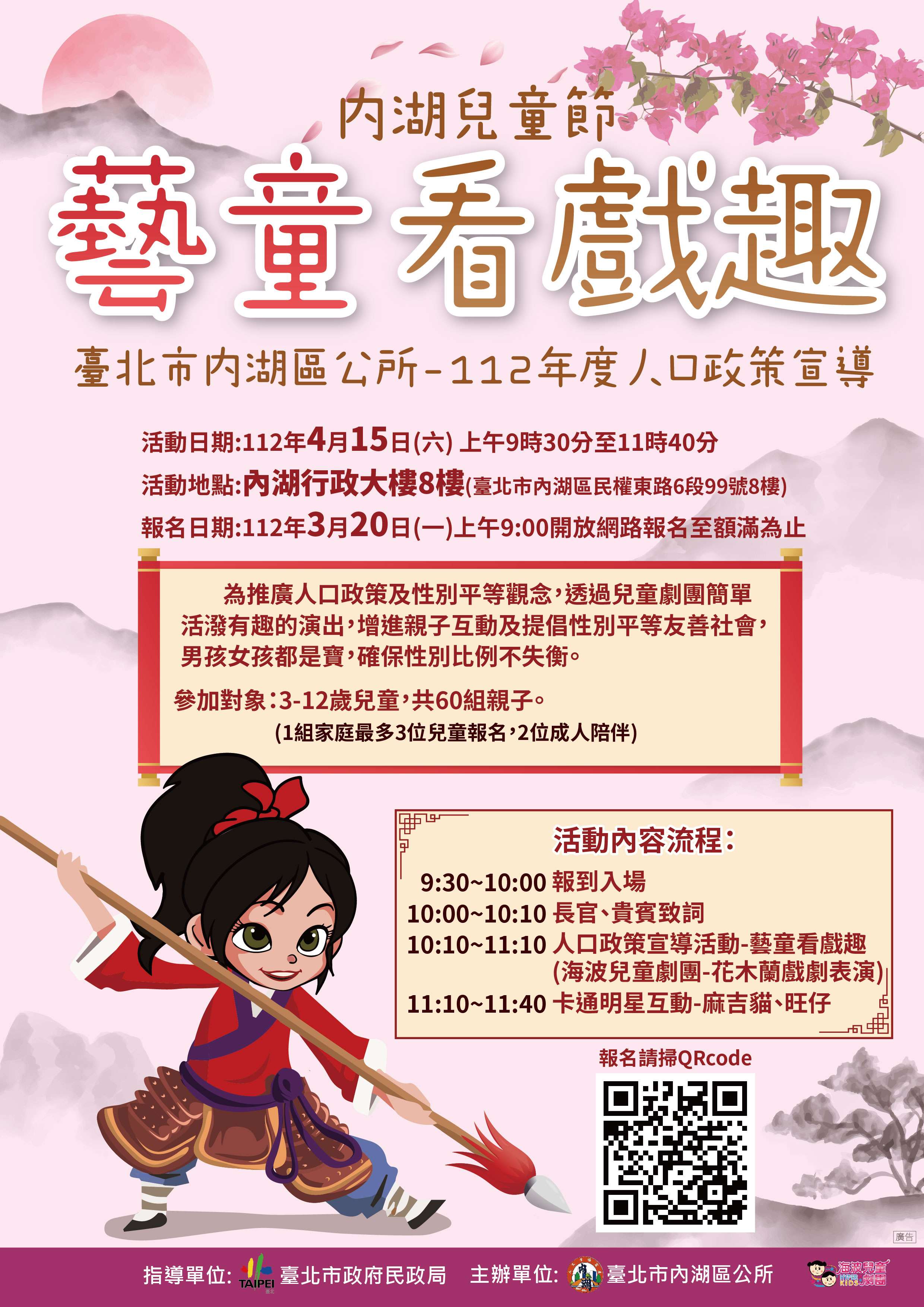 臺北市內湖區公所112年度人口政策宣 導「內湖兒童節-藝童看戲趣」,為推廣人口政策及性別平 等觀念,特別邀請海波兒童劇團演出精采經典大戲「花木 蘭」,於4月15日(星期六),臺北市內湖區行政中心8樓 大禮堂(臺北市內湖區民權東路6段99號8樓)舉辦,3月20 日開放網路報名60組親子家庭,額滿為止,每組家庭贈送1 份宣導禮,現場有卡通明星互動、古早童玩區讓小朋友好 看好玩又有得拿。(本次活動為線上網路報名),詳情請 參閱內湖區公所網站-最新消息。