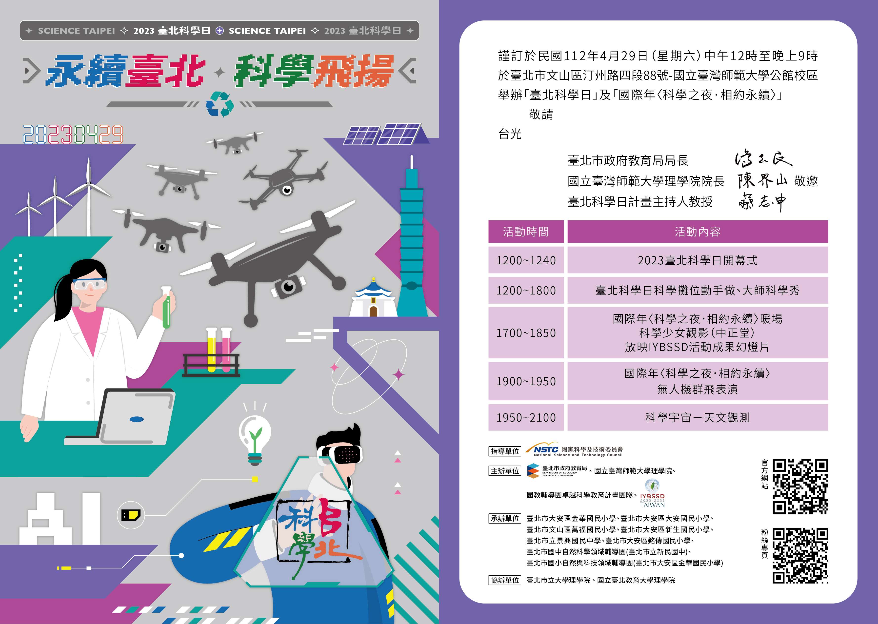 二、旨案係由本局與國立臺灣師範大學理學院物理學系合作舉辦,本年度將於112年4月29日(星期六)假師大公館校區辦理科學體驗實作活動,並響應聯合國教育科學及文化組織「基礎科學促進永續發展國際年」理念,藉本活動「永續臺北—科學飛揚」之主題,彰顯本市對於推動科學教育的重視。