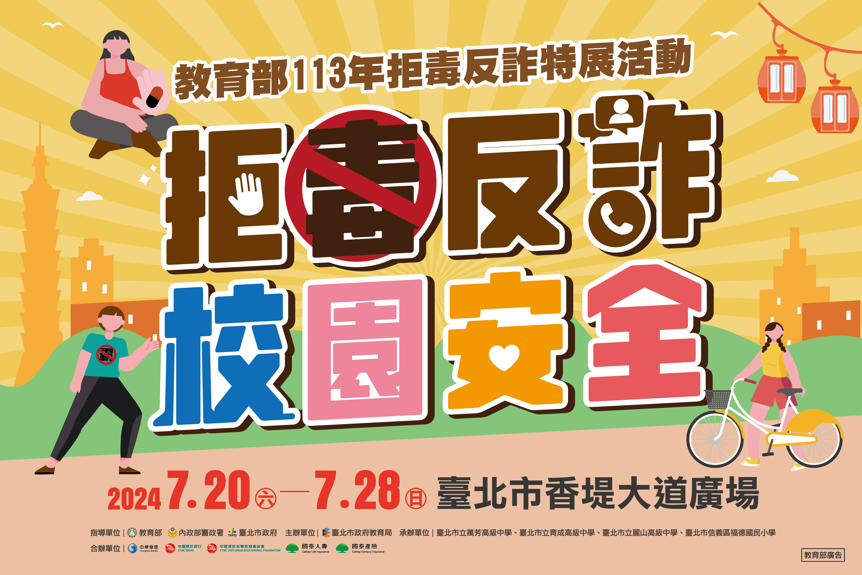 教育部與臺北市政府於7月20日(六)至7月28日(日)在信義香堤廣場舉辦教育部113年拒毒反詐特展活動,今年結合反毒、反詐、反霸凌與交通安全,邊學邊玩邊闖關,有機會獲得限量禮品哦!