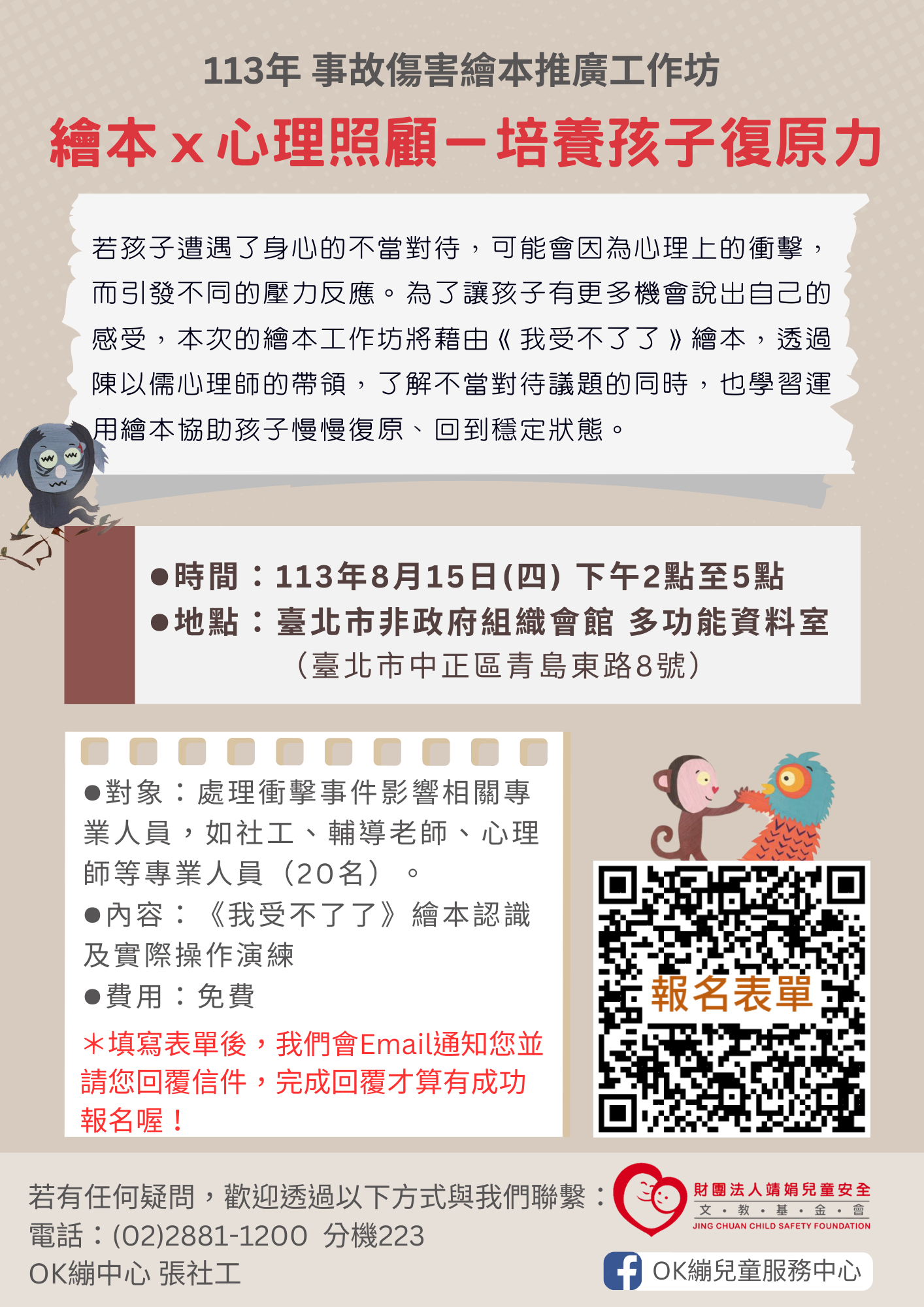 (一)參加對象:處理衝擊事件影響相關專業人員,如社工、 輔導老師、心理師等。 (二)地點:臺北市非政府組織會館多功能資料室(臺北市中 正區青島東路8號)。 (三)內容:《我受不了了》繪本認識及實際操作演練。