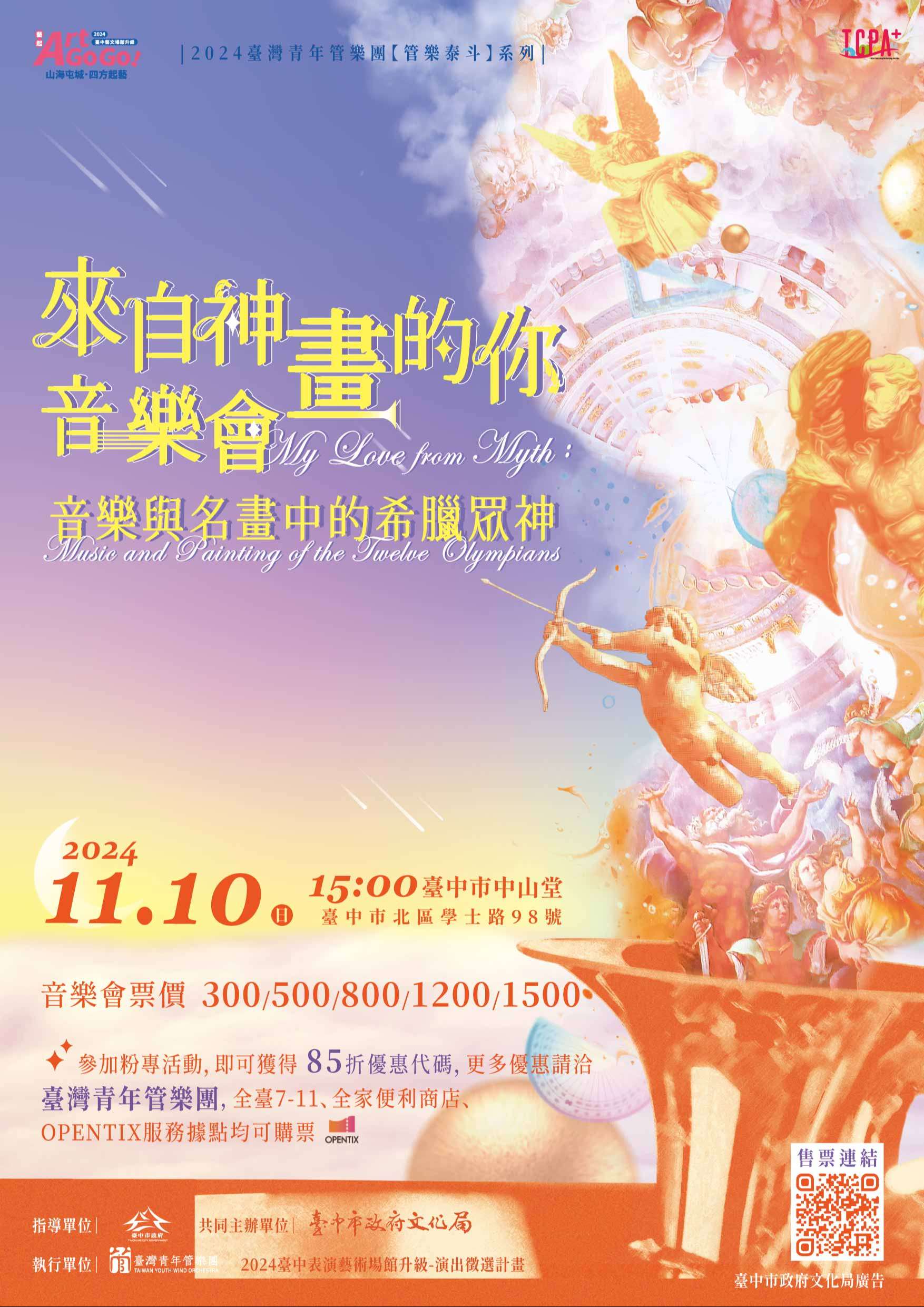 二、節目介紹:臺灣青年管樂團『管樂泰斗』系列音樂會, 2024隆重呈現【來自神畫的你】音樂會-音樂與名畫中的希 臘眾神,是一場融合希臘神話與西班牙作曲家奧斯卡·納瓦 羅的《奧林帕斯諸神》交響組曲的音樂會。十個樂章生動 描繪十二位神祗,以具挑戰性的曲目展現管樂團的卓越演 奏技巧;特邀Podcaster葵花子在樂章中介紹名畫,讓觀眾 更深入理解神話故事。