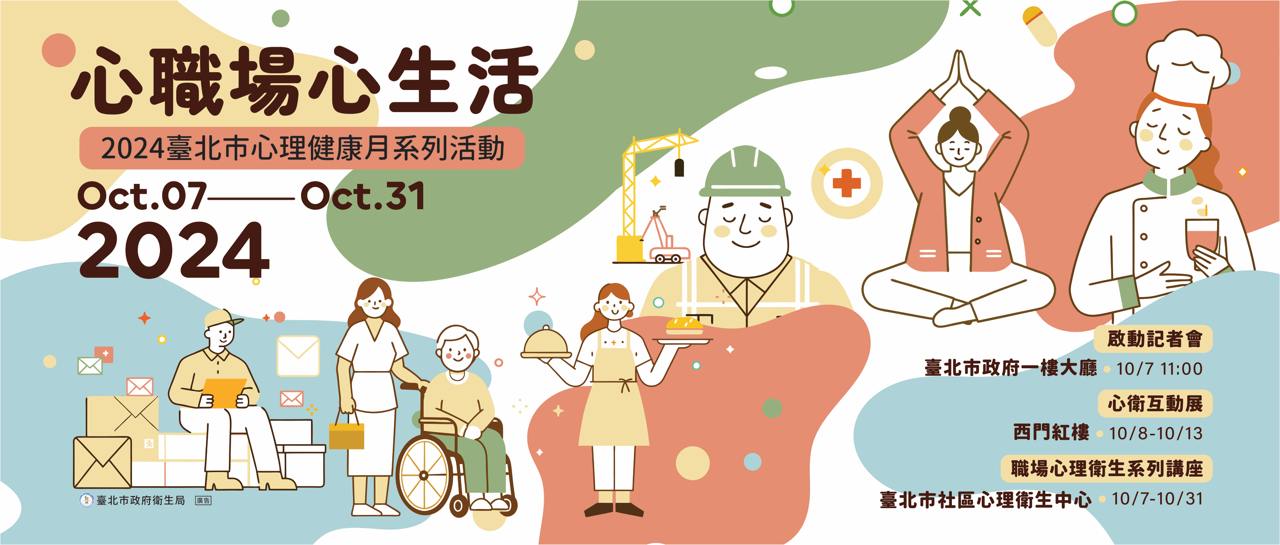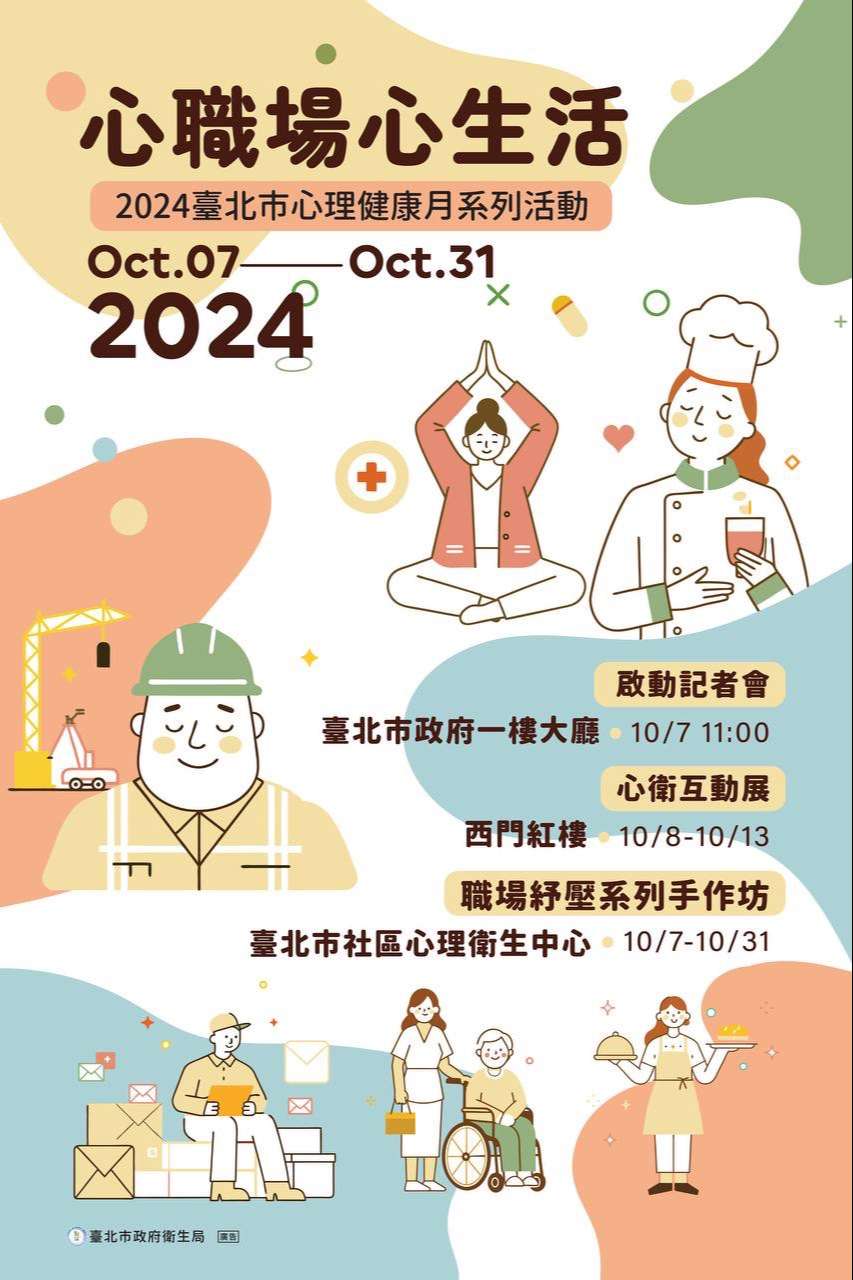 二、本府衛生局近期辦理「2024心理健康月-『心職場心生 活』」系列活動,請貴校協助將活動宣傳文字及海報放置 於校網、跑馬燈或公告電視牆等地方廣為宣傳。
