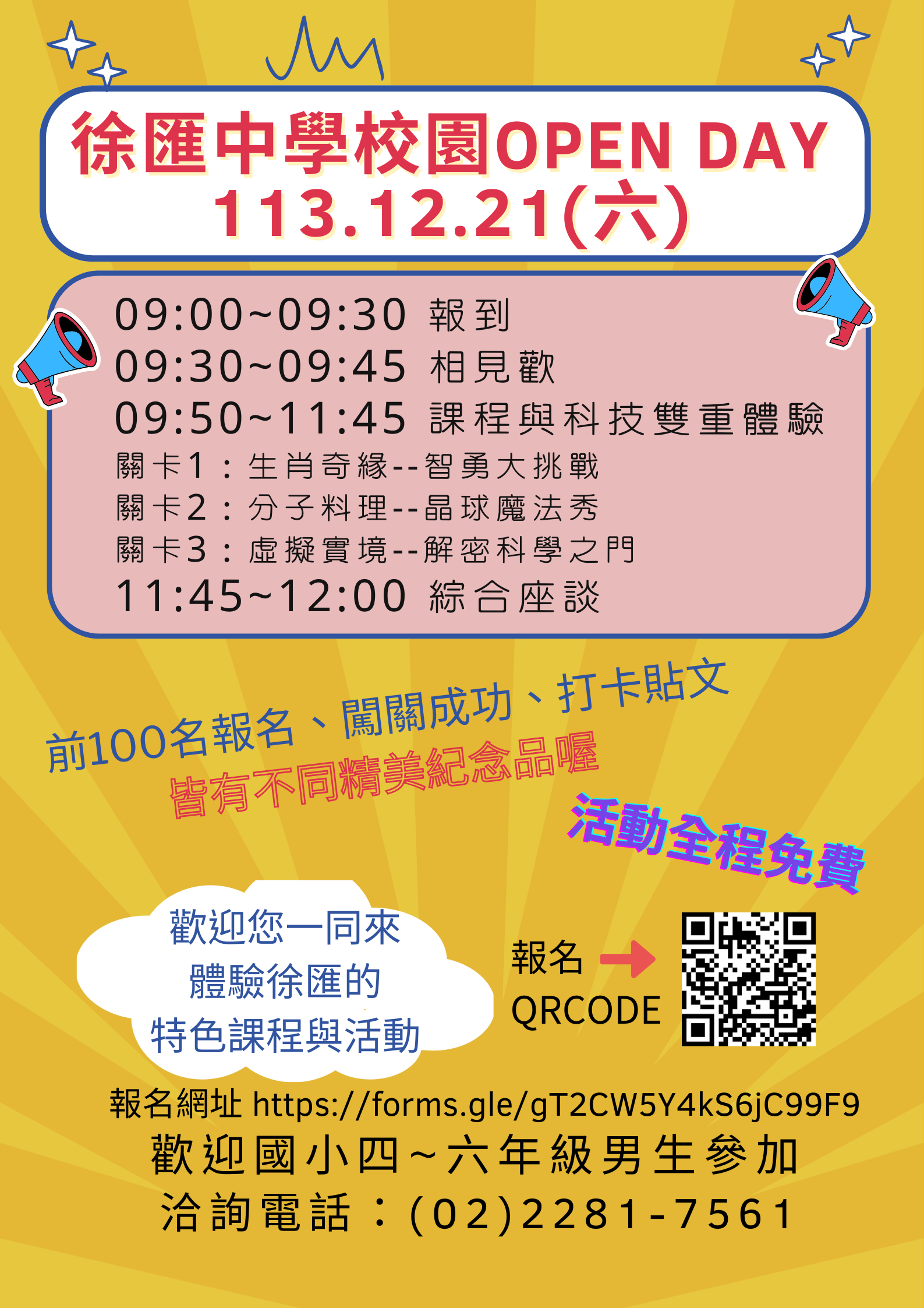 一、本校著重培育學生具備自覺、才智、愛心、豪氣四大能 力,歡迎國小學生參加本校辦理之「徐匯OPEN DAY」,親 自體驗本校特色課程及特色活動。