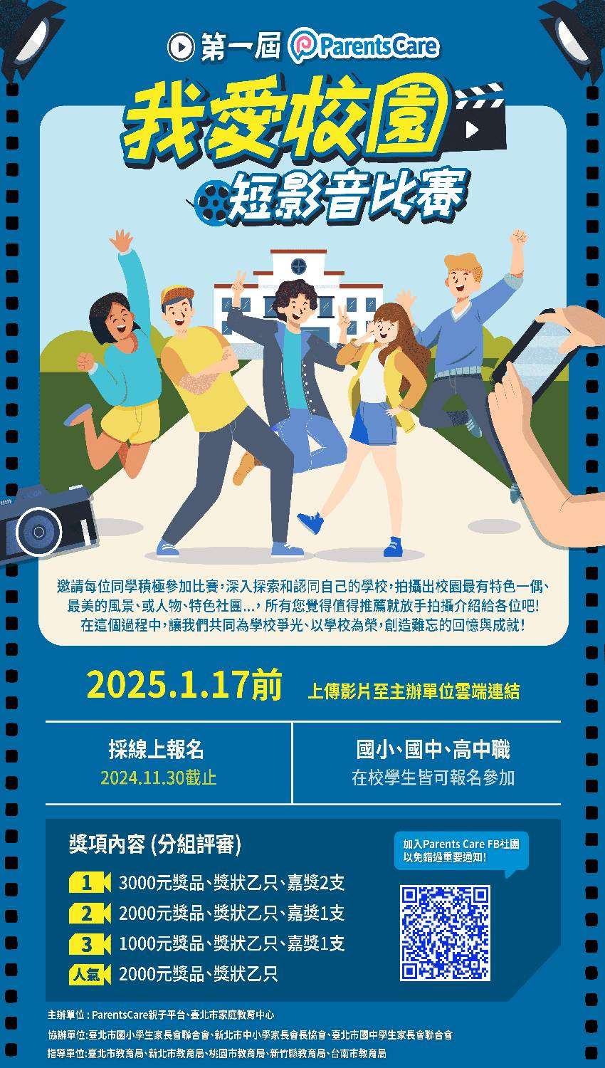 一、比賽報名網址https://www.beclass.com /rid=2748c55634801c34e9dd,活動詳情可至ParentsCare 家長大小事FB粉絲專頁(https://www.facebook.com /groups/434955752481737/)查詢。