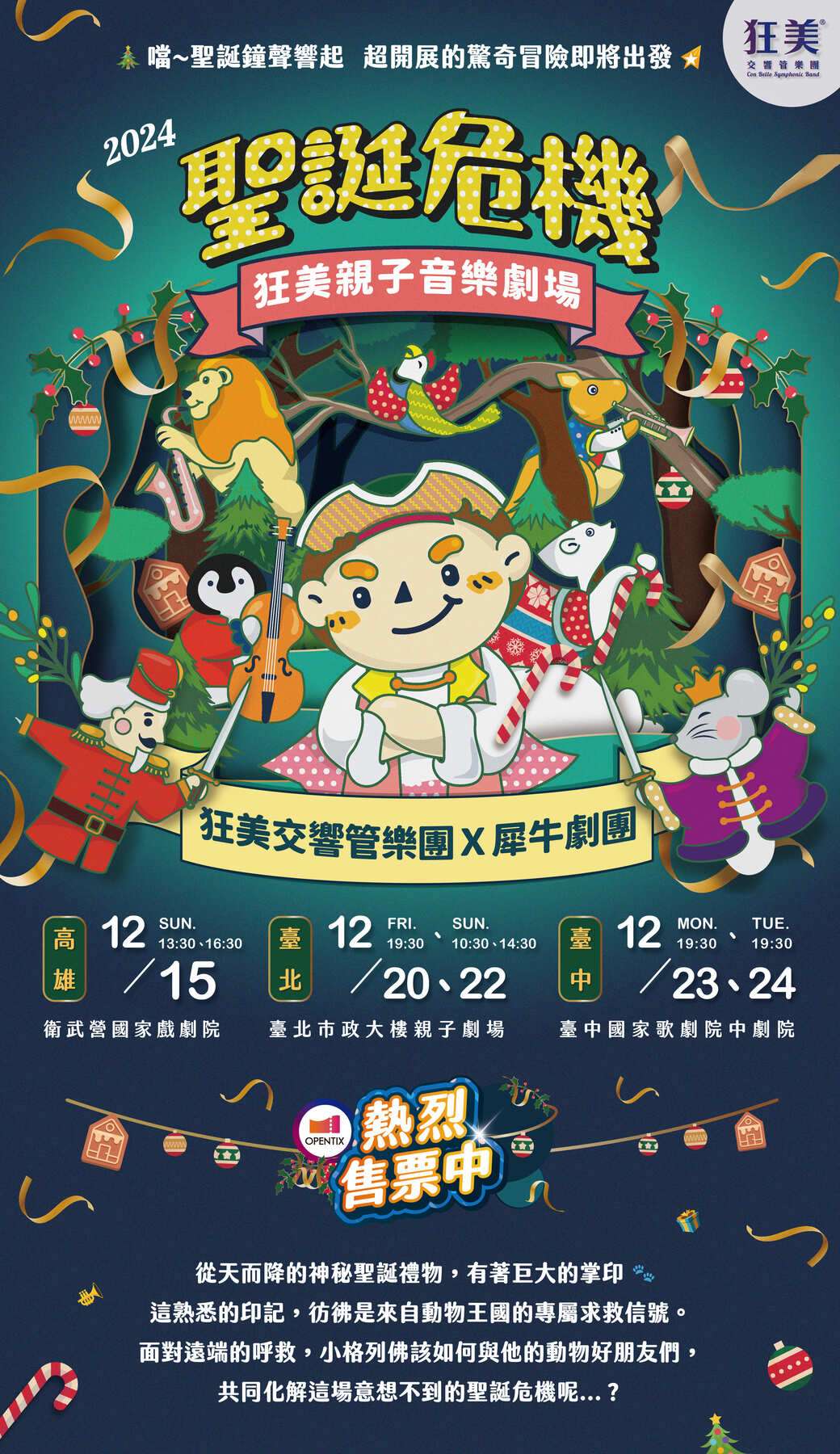 一、節目介紹:狂美交響管樂團x犀牛劇團-跨界親子音樂劇場 《聖誕危機》從天而降的神秘聖誕禮物,有著巨大的掌印這熟悉的印記,彷彿是來自動物王國的專屬求救信號。面 對遠端的呼救,小格列佛該如何與他的動物好朋友們,共同化解這場意想不到的聖誕危機呢...?