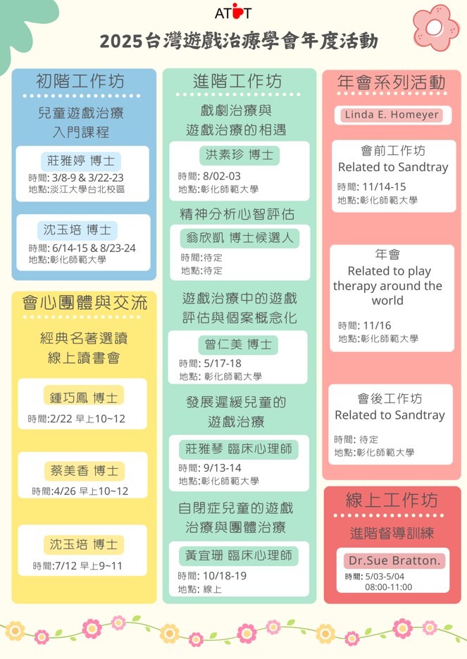 [轉知]遊戲治療學會2025年相關系列活動資訊 更多資訊請參考學會網站公告(https://www.atpt.org.tw /news-id-196)。