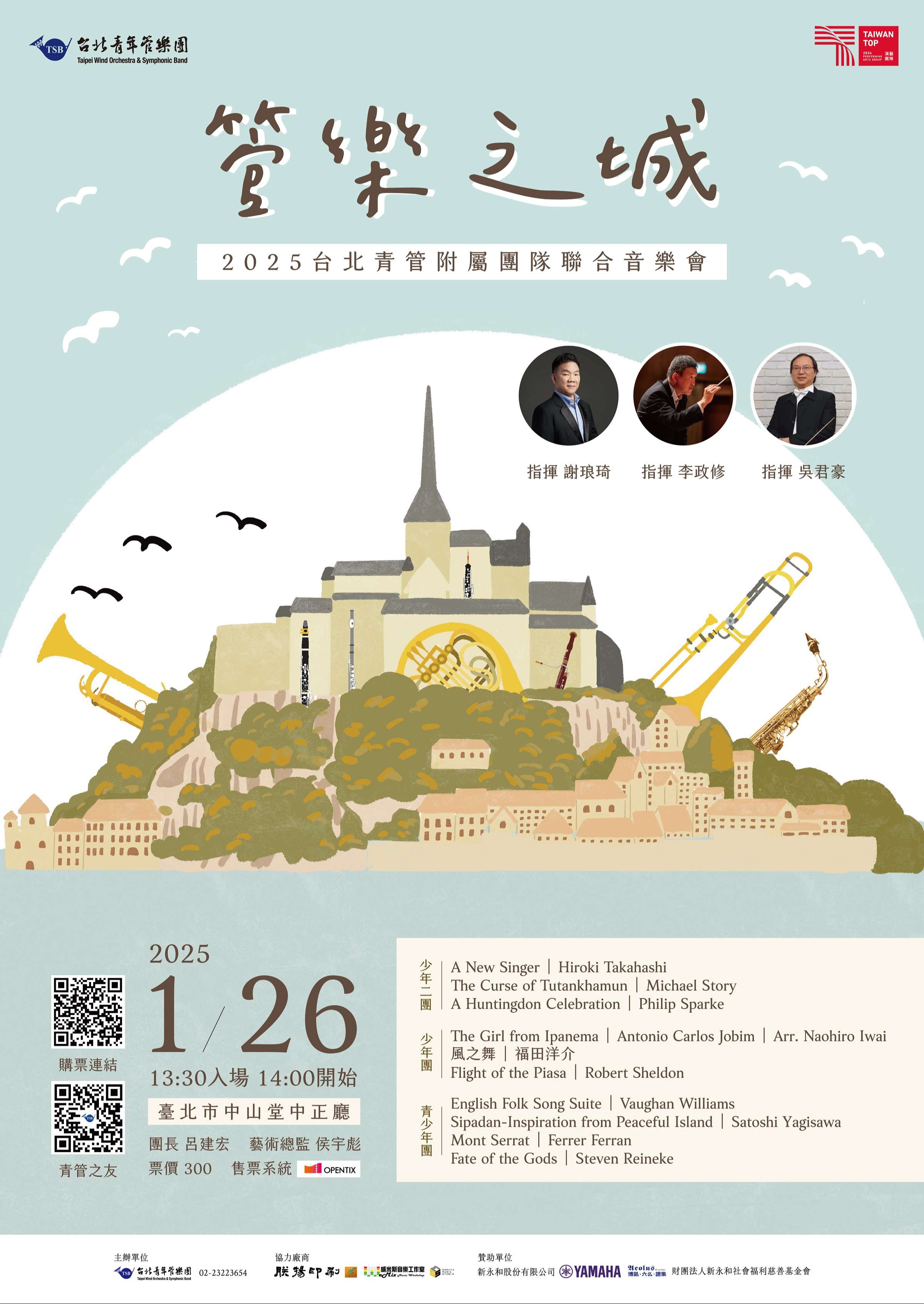 一、2025台北青管附屬團隊聯合音樂會,由謝琅琦、李政修與吳君豪3位老師,指揮台北青管附屬團隊演出,帶來一連串 耳熟能詳的管樂經典曲目。 二、旨揭音樂會相關訊息如下: