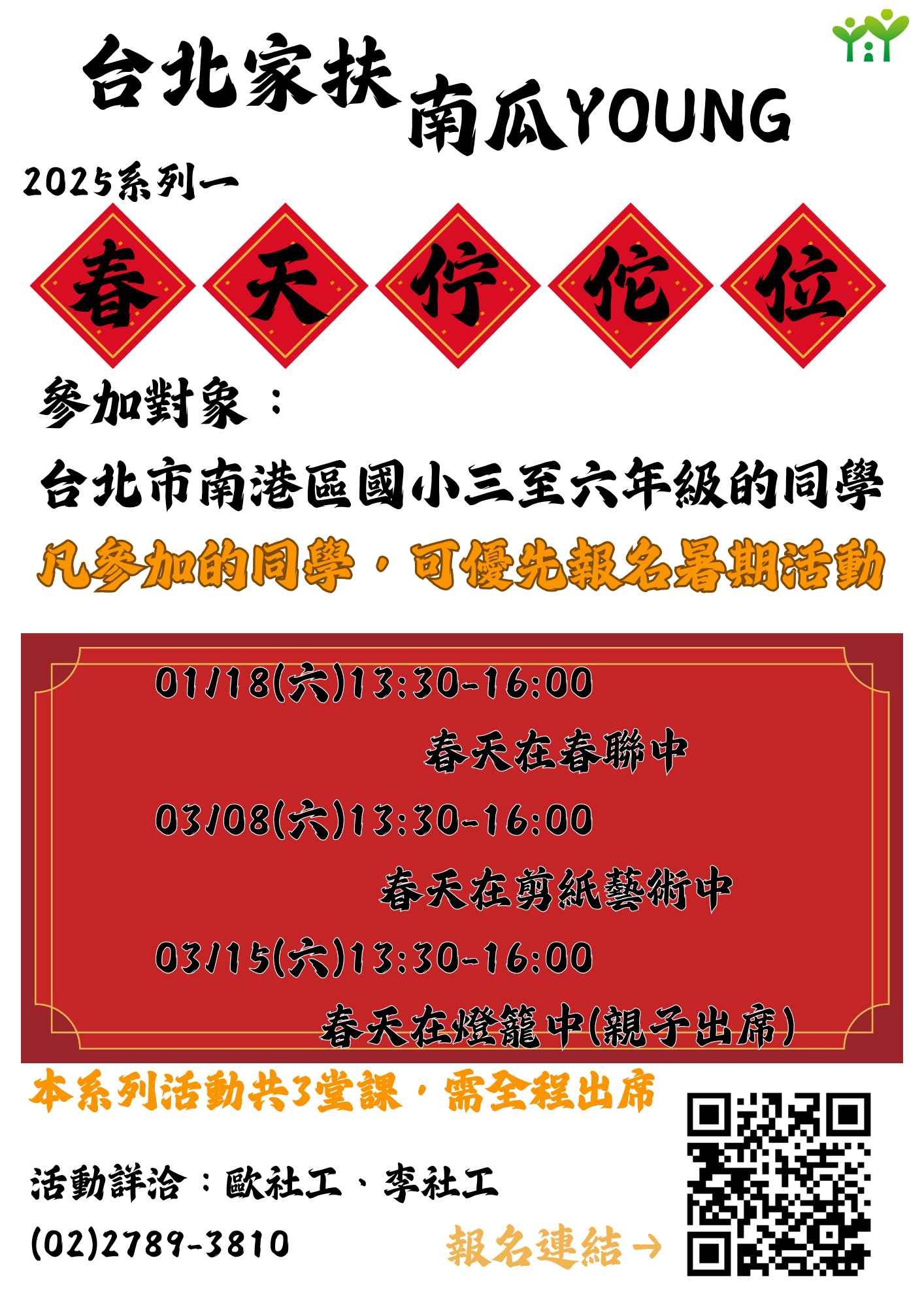 一、台北家扶中心辦理「2025年第一季南瓜YOUNG」社區活動, 主題為「春天佇佗位」,將透過春聯、剪紙及親子燈籠, 帶著孩子們一起尋找春天的足跡。