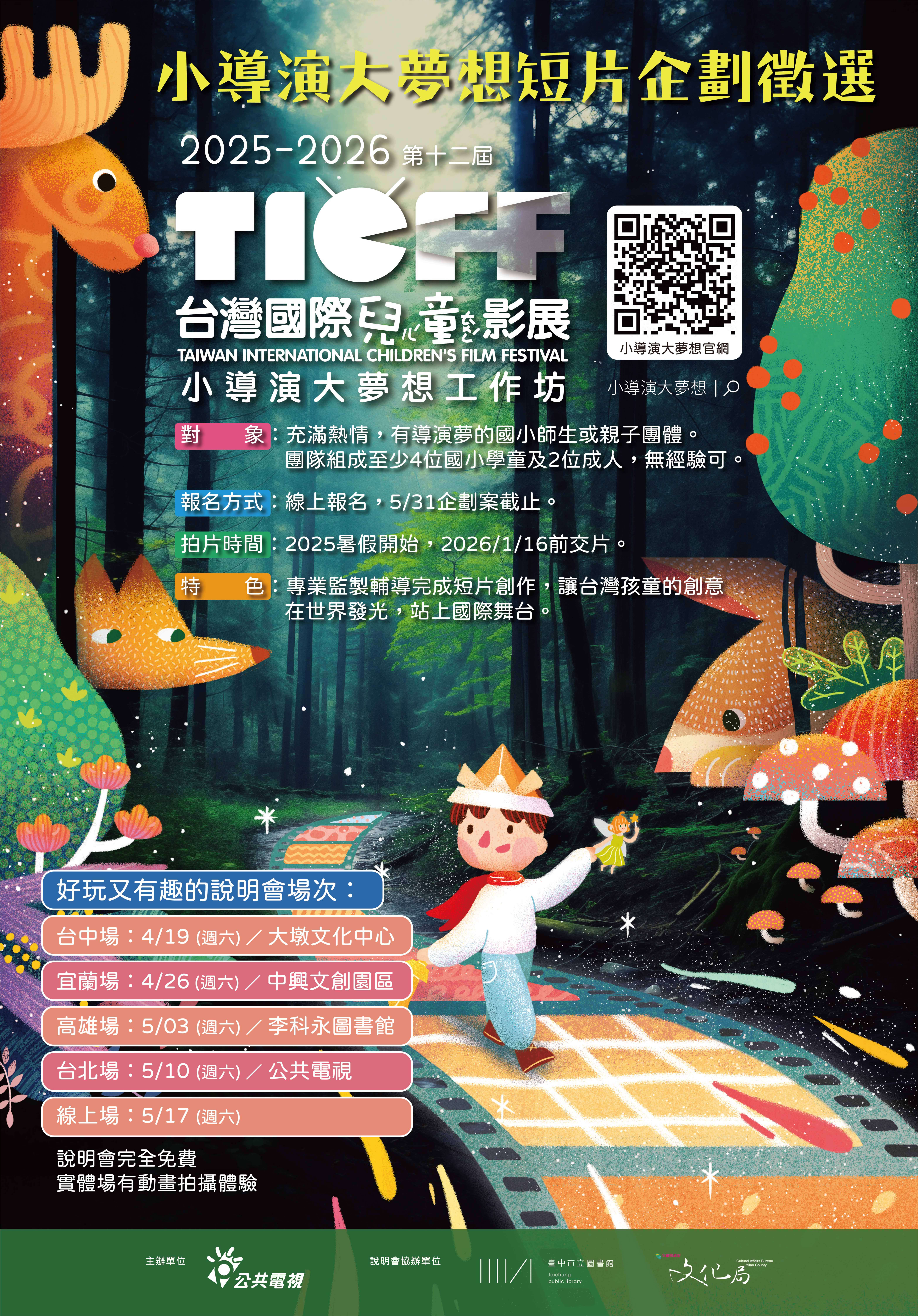 三、「兒童短片企劃案徵選」於2025/5/31截止收件,歡迎國小師生、親子團隊組隊上網報名。提出拍片企劃參加徵選, 入選團隊可享整套拍片輔導資源,完成短片擇優送國際參展。相關活動細節請上活動官網 https://www.pts.org.tw /dreamer12/