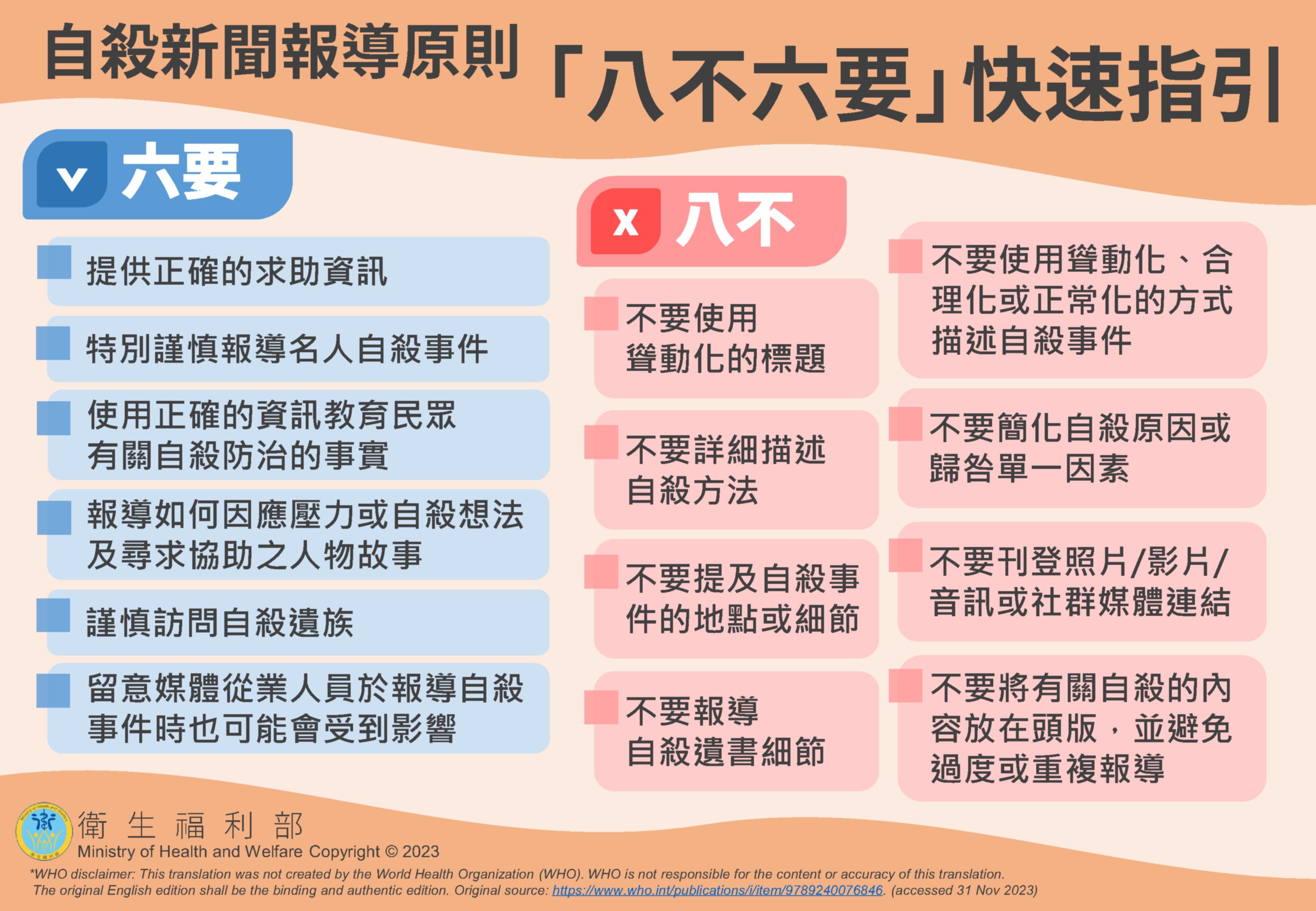 四、隨函檢附「自殺新聞報導原則八不六要快速指引」1則。
