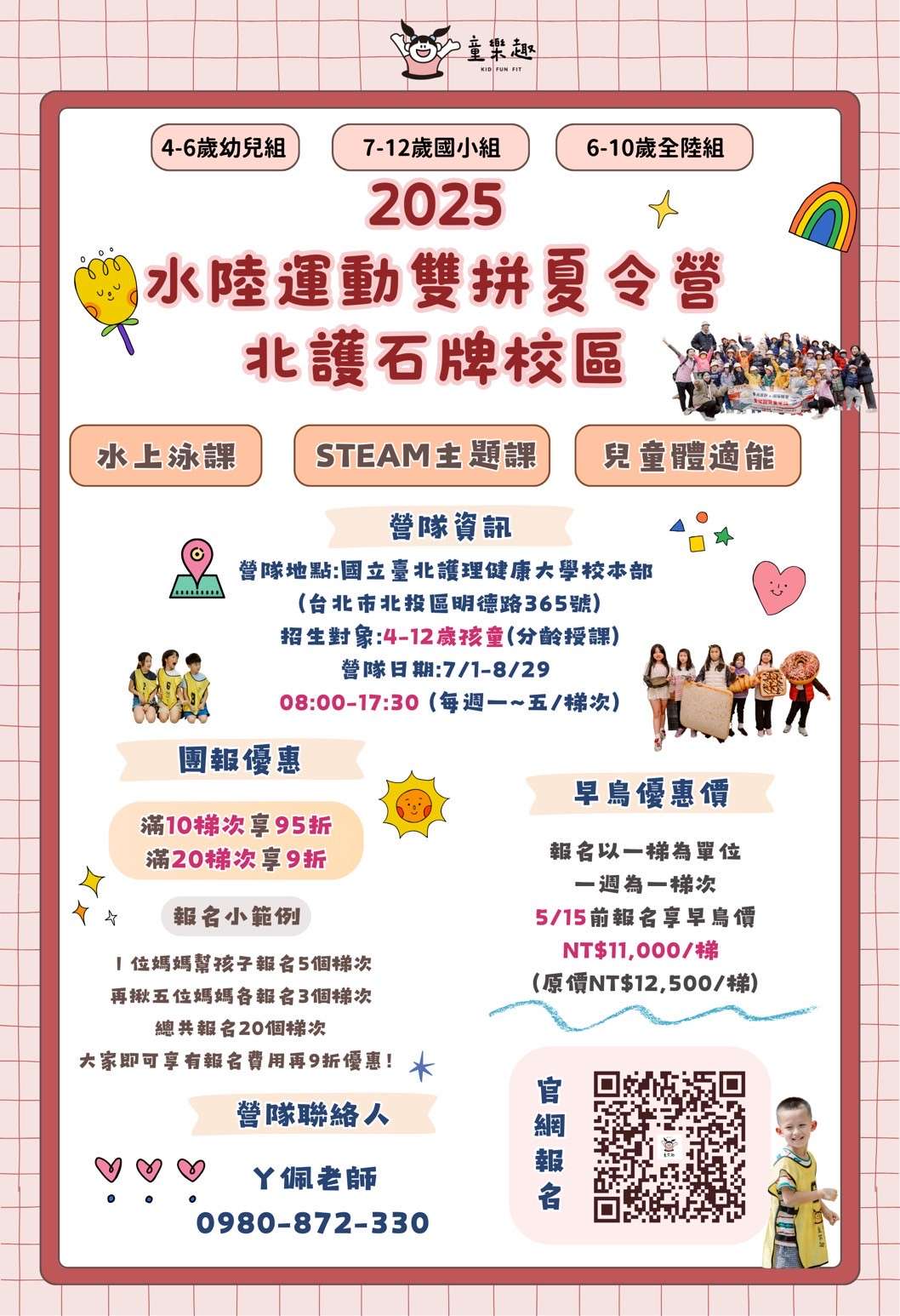 一、國立台北護理健康大學推廣教育中心與童博健康管理工作室合作開辦「2025 水陸運動夏令營」即日起受理報名。