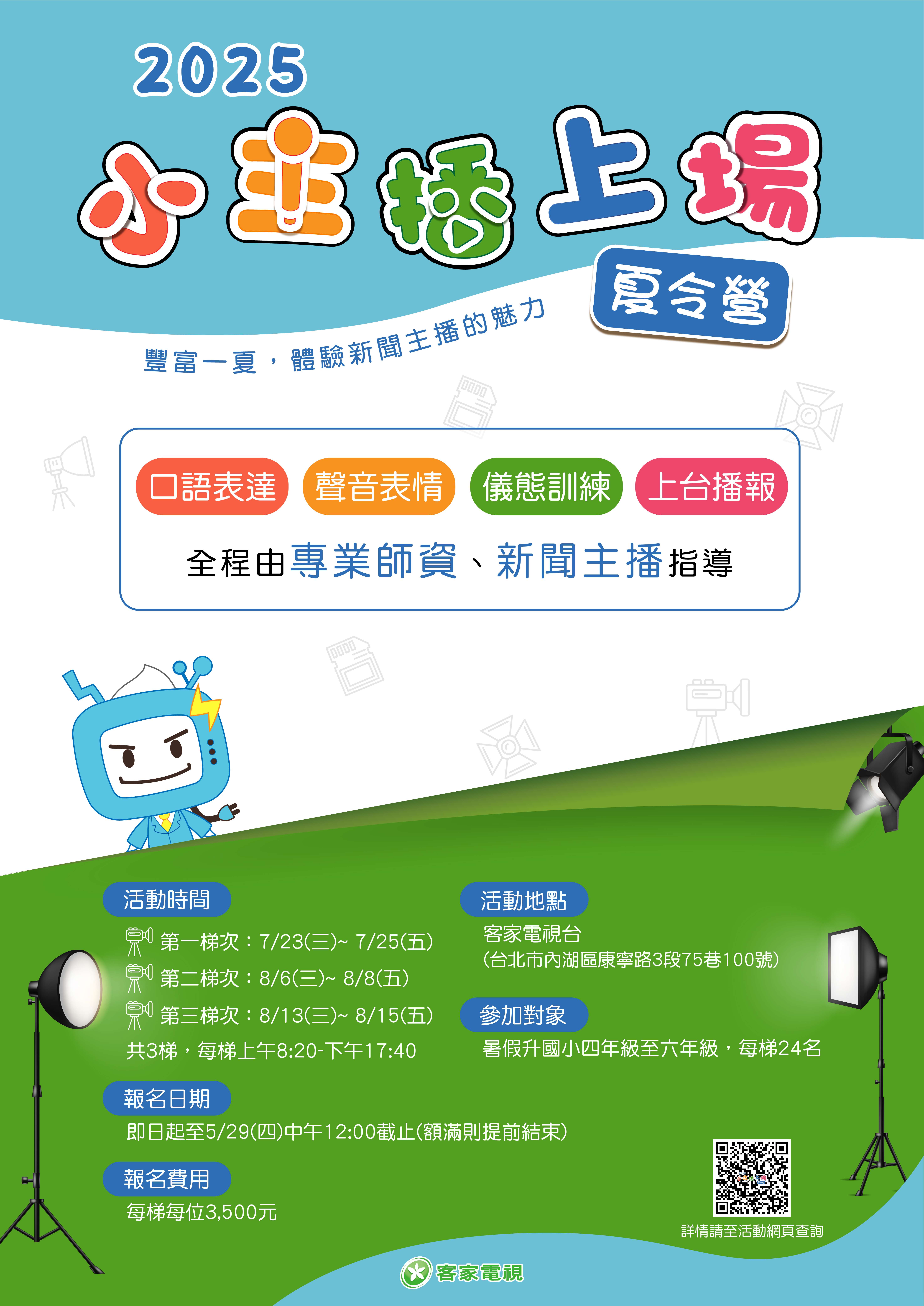 一、為增進學童媒體素養、語言表達能力及團隊合作精神,並 透過分組學習與實際演練,體驗新聞製作及主播播報技巧,本會客家電視特於暑期舉辦「2025客家電視小主播上 場夏令營」,針對暑期後國小四到六年級學生設計內容, 並邀請專業講師及新聞主播進行授課。