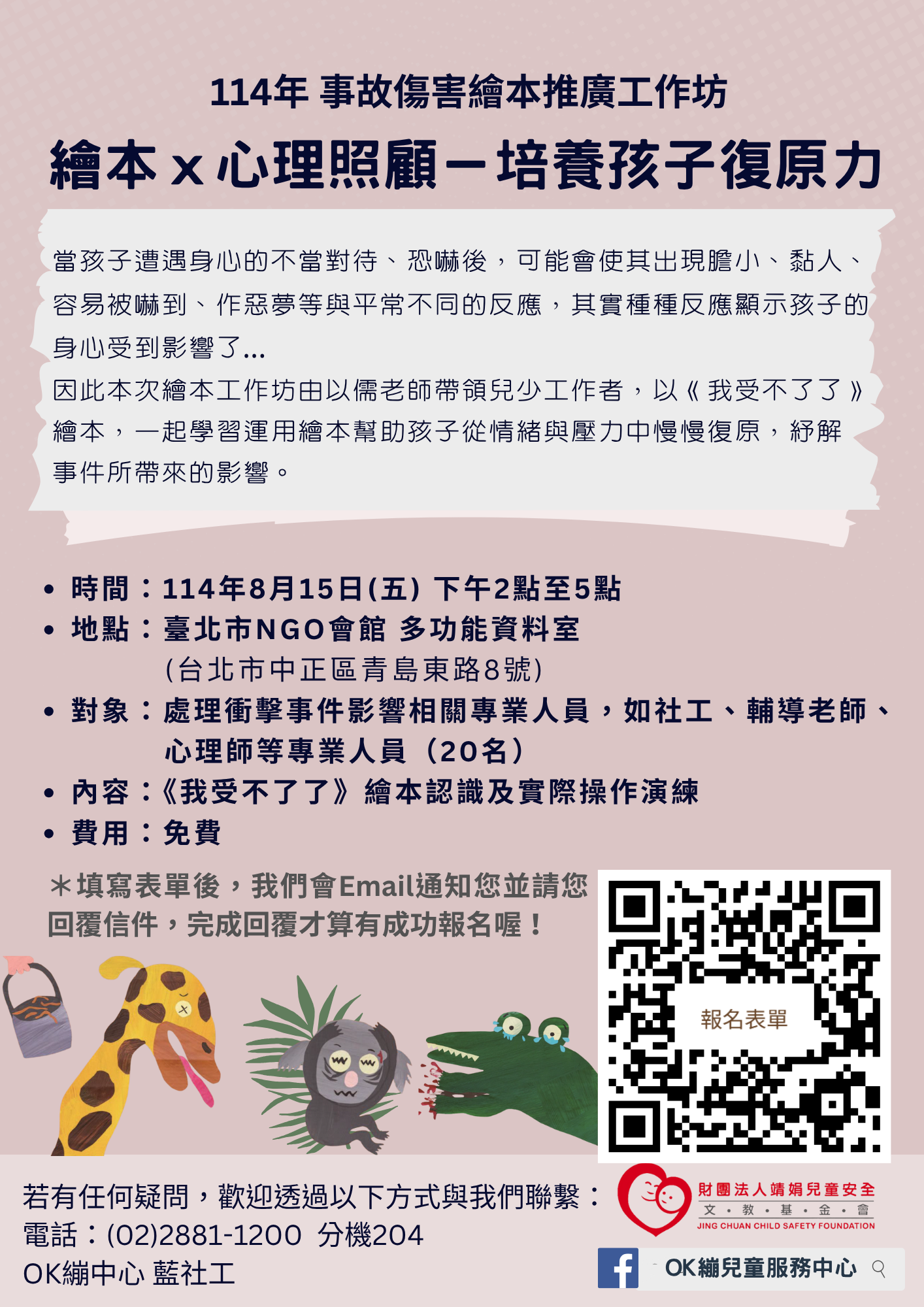 三、檢附「114年事故傷害繪本推廣工作坊《繪本x心理照顧— 培養孩子復原力》」宣傳單1份。