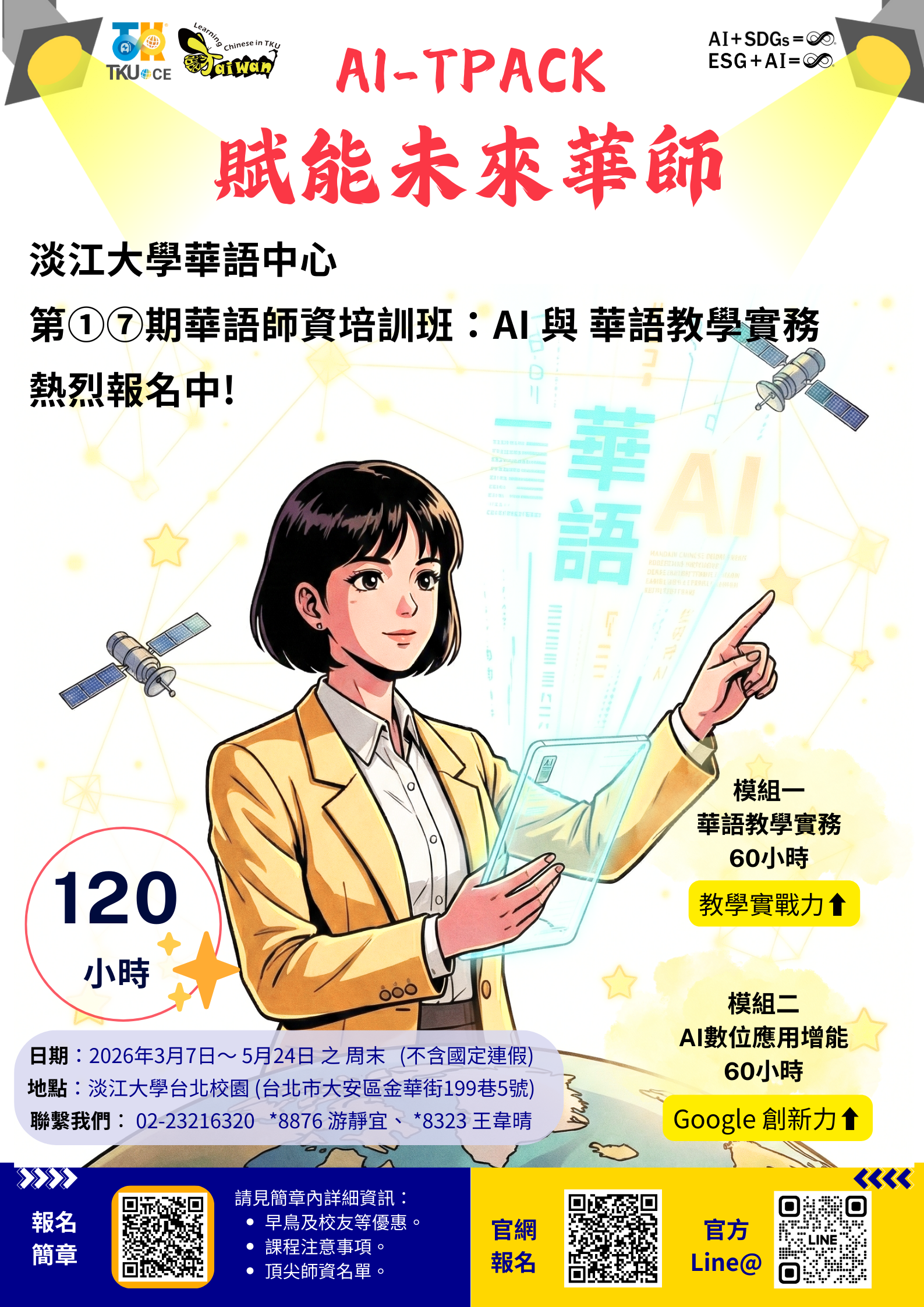 淡江大學華語中心第十七期師資培訓班AI與教學實務課程招生資訊詳附件