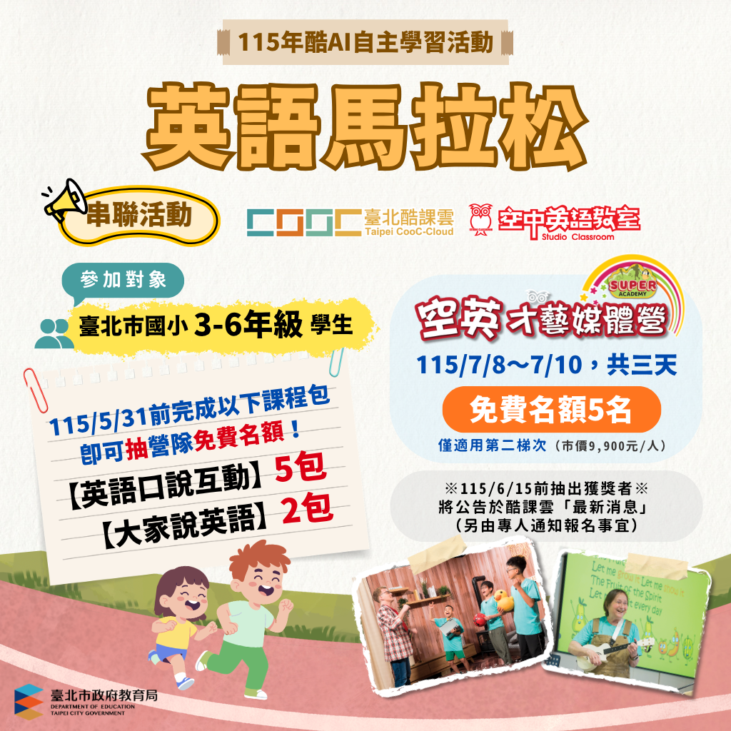 (二)學習任務獎勵:學生於115年5月31日前,完成酷AI「英 語互動口說」課程包5包及「大家說英語」課程包2包, 即可獲得加碼獎勵抽獎機會,將抽出營隊免費參加名額5名(備取10名,依序遞補),預計6月15日前抽出獲獎者 並公告於酷課雲最新消息,另由專人通知報名事宜。